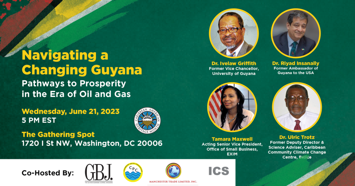 Guyana stands to earn tens of billions of US dollars over the next two decades from developing the burgeoning oil and gas sector. What does this mean for Guyana and, importantly, the hundreds of thousands in the Diaspora? What are the pathways to our collective prosperity? To answer some of these questions, The Guyana Business Journal & Magazine (GBJ), the Caribbean Policy Consortium, and Manchester Trade Inc., with the support of the Institute of Caribbean Studies, will host a public forum Navigating a Changing Guyana: Pathways to Prosperity in the Era of Oil and Gas, a free public forum on Wednesday, June 21, from 5:00-7:00 p.m. at The Gathering Spot 1720 I St NW, Washington, DC 20006)
