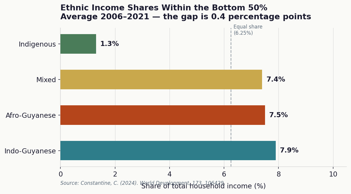 The difference between the Indo-Guyanese and Afro-Guyanese share of income in the bottom half of the population is 0.4 percentage points. Four-tenths of a percent. At the bottom of the ladder, identity politics has conferred no material advantage to anyone. The working poor of all ethnicities are sharing the same inadequate slice of the national pie.